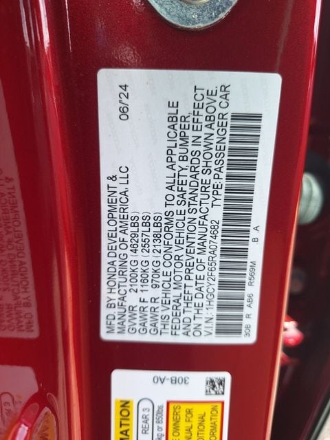 4-Wheel Disc Brakes, 8 Speakers, ABS brakes, Adaptive Cruise Control: Adaptive Cruise Control (ACC) with Low-Speed Follow, Air Conditioning, Alloy wheels, AM/FM radio, Apple CarPlay/Android Auto, Auto High-beam Headlights, Auto-dimming Rear-View mirror, Automatic temperature control, Blind Spot Information (BSI) System warning, Brake assist, Bumpers: body-color, Compass, Delay-off headlights, Driver door bin, Driver vanity mirror, Dual front impact airbags, Dual front side impact airbags, Electronic Stability Control, Emergency communication system: HondaLink, Exterior Parking Camera Rear, Four wheel independent suspension, Front anti-roll bar, Front Bucket Seats, Front Center Armrest, Front dual zone A/C, Front reading lights, Fully automatic headlights, Heated door mirrors, Heated Front Bucket Seats, Heated front seats, Illuminated entry, Knee airbag, Lane departure: Lane Keeping Assist System (LKAS) active, Leather Shift Knob, Leather steering wheel, Leather-Trimmed Seat Trim, Low tire pressure warning, Memory seat, Occupant sensing airbag, Outside temperature display, Overhead airbag, Overhead console, Panic alarm, Passenger door bin, Passenger vanity mirror, Power door mirrors, Power driver seat, Power moonroof, Power passenger seat, Power steering, Power windows, Radio data system, Radio: 180-Watt Audio System, Rear anti-roll bar, Rear reading lights, Rear seat center armrest, Rear side impact airbag, Rear window defroster, Remote keyless entry, Security system, Speed control, Speed-sensing steering, Speed-Sensitive Wipers, Split folding rear seat, Steering wheel mounted audio controls, Telescoping steering wheel, Tilt steering wheel, Traction control, Trip computer, Turn signal indicator mirrors, Variably intermittent wipers, Wheels: 17" x 7.5J Pewter Gray, Virtual appointments, Home Delivery.