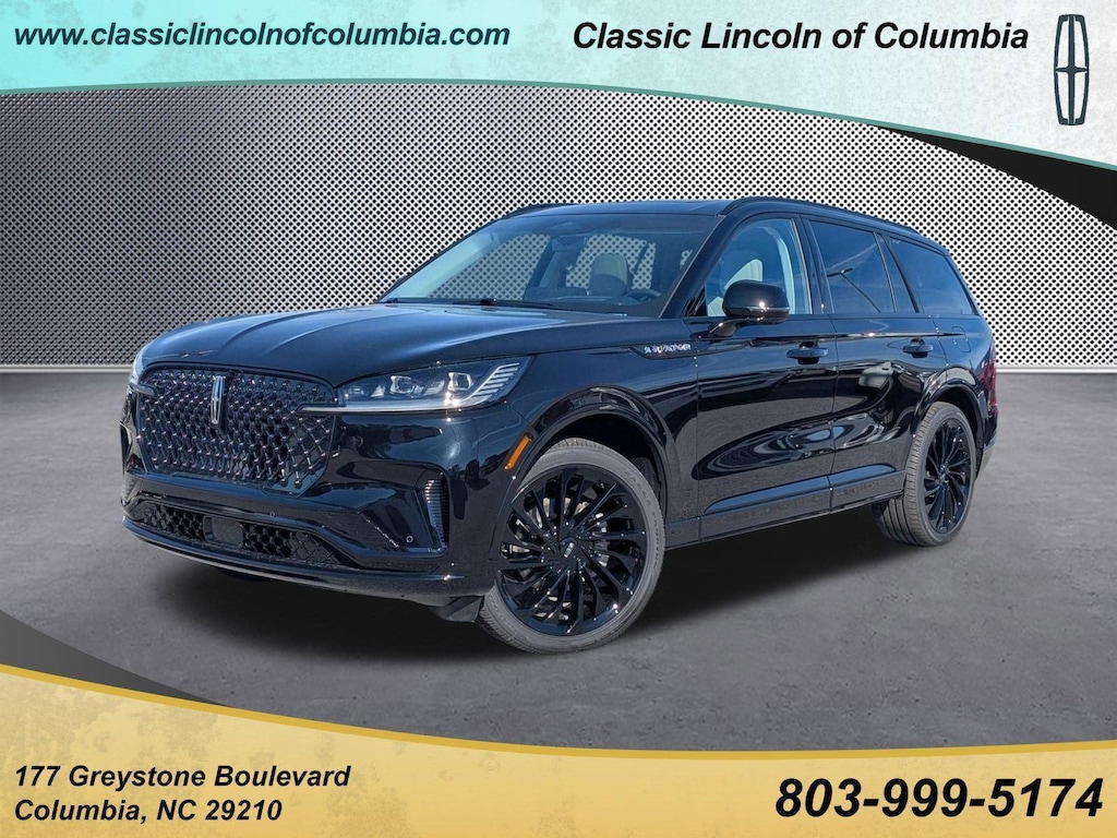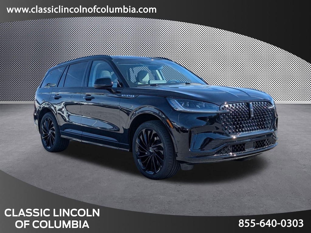 Extended Service Programs Available, 14 Speakers, 30-Way Perfect Position Seats w/Active Motion, 3rd row seats: split-bench, 4-Wheel Disc Brakes, 40/Mini Console/40 Dual Captain's Chairs, ABS brakes, Adaptive Dynamic Bending Lighting, Adaptive Pixel LED Headlamps, Adaptive suspension, Advanced Heads-Up Display, Air Conditioning, Alloy wheels, AM/FM radio: SiriusXM, Apple CarPlay/Android Auto, Audio memory, Auto Air Refresh, Auto High-beam Headlights, Auto-dimming door mirrors, Auto-dimming Rear-View mirror, Automatic temperature control, Black Exterior Elements, Body-Color Exterior Elements, Brake assist, Bumpers: body-color, Compass, Delay-off headlights, Driver door bin, Driver vanity mirror, Dual front impact airbags, Dual front side impact airbags, Electronic Stability Control, Equipment Group 200A, Four wheel independent suspension, Front anti-roll bar, Front Bucket Seats, Front Center Armrest, Front dual zone A/C, Front reading lights, Fully automatic headlights, Garage door transmitter, Heads-Up Display, Heated door mirrors, Heated front seats, Heated steering wheel, HVAC memory, Illuminated entry, Illuminated Lincoln Star in Grille, Illumination Package, Jet Appearance Package, Knee airbag, Leather steering wheel, Lincoln BlueCruise Equipped (4-Years Included), Lincoln Digital Experience, Lincoln Dynamic Signature Lighting, Low tire pressure warning, Luxury Package, Memory seat, Navigation system: Connected Navigation (1-year trial), Occupant sensing airbag, Outside temperature display, Overhead airbag, Overhead console, Panic alarm, Passenger door bin, Passenger vanity mirror, Power door mirrors, Power driver seat, Power Liftgate, Power moonroof: Panoramic Vista Roof, Power passenger seat, Power steering, Power windows, Premium Lthr Heated/Ventilated Fnt Captain's Chairs, Radio data system, Radio: Revel Audio System w/14 Speakers, Radio: Revel Ultima 3D Audio System w/28 Speakers, Rain sensing wipers, Rear air conditioning, Rear anti-roll bar, Rear audio controls, Rear dual zone A/C, Rear reading lights, Rear window defroster, Rear window wiper, Remote keyless entry, Security system, SiriusXM, Speed control, Speed Dependent Lighting, Speed-Sensitive Wipers, Split folding rear seat, Spoiler, Steering wheel memory, Steering wheel mounted A/C controls, Steering wheel mounted audio controls, Tachometer, Telescoping steering wheel, Tilt steering wheel, Traction control, Trip computer, Turn signal indicator mirrors, Variably intermittent wipers, Ventilated front seats, Wheels: 21 Bright-Machined Aluminum, Wheels: 22 Black Aluminum w/Adaptive Suspension, Wireless Charging Pad.2025 Lincoln Aviator Reserve Black Metallic AWD 10-Speed Automatic 3.0L V6Drivers in the greater Columbia SC rely on us for their next new or Lincoln Certified Pre-owned vehicle and automotive needs because we treat them like family. Customers make the trip from Lexington, Orangeburg, and Sumter because we are the new Lincoln dealership in the area that not only provides an array of quality products and services, but customer care that is unmatched! Here, at the Classic Lincoln of Columbia deal, you can count on the integrity of our Lincoln Certified Pre-owned vehicle collection.While every reasonable effort is made to ensure the accuracy of this information, it is the customers responsibility to verify price, vehicle equipment and availability with Classic Lincoln of Columbia. Price shown does include $699.00 closing fee but not applicable taxes, tag fees, and dealer installed accessories.