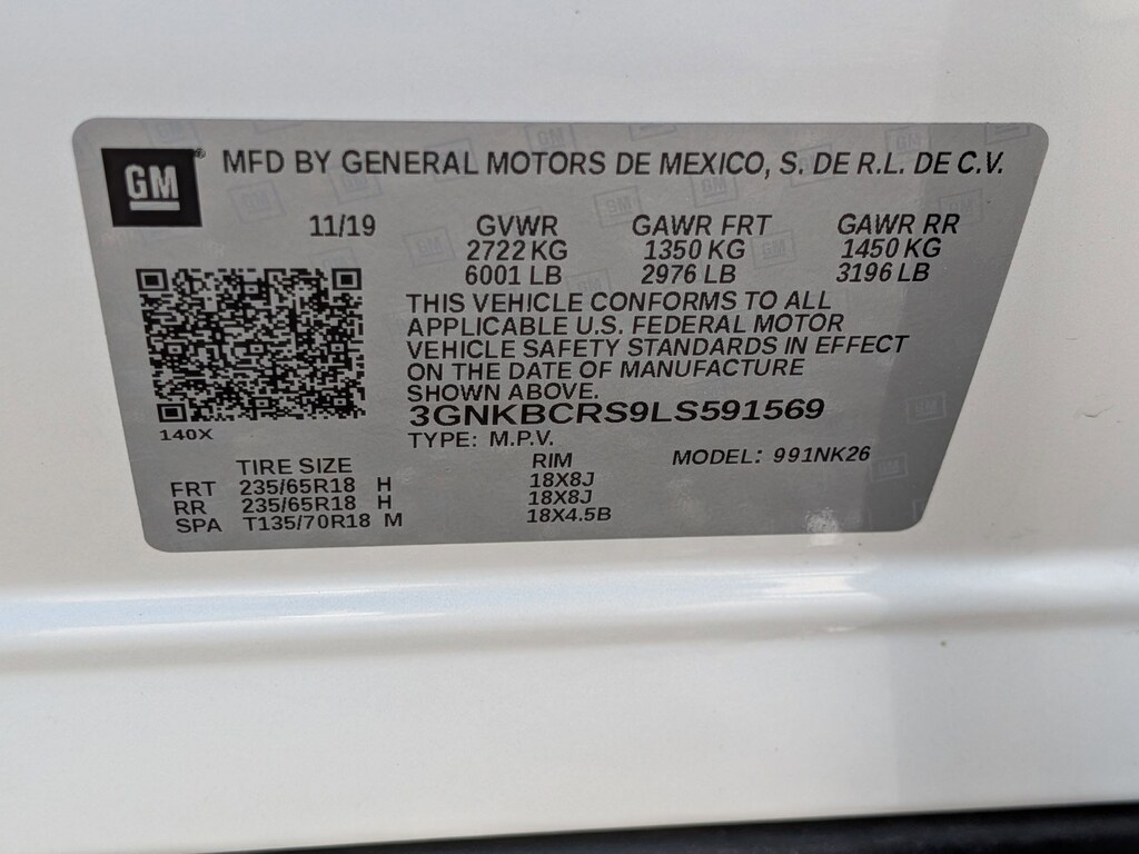 EMISSIONS, CONNECTICUT, DELAWARE, MAINE, MARYLAND, MASSACHUSETTS, NEW JERSEY, NEW YORK, OREGON, PENNSYLVANIA, RHODE ISLAND, VERMONT AND WASHINGTON STATE REQUIREMENTS, EMISSIONS OVERRIDE, FEDERAL, ENGINE, 3.6L V6, SIDI, DOHC WITH VARIABLE VALVE TIMING (VVT), TRANSMISSION, 9-SPEED AUTOMATIC, ELECTRONICALLY-CONTROLLED, AXLE, 3.49 FINAL DRIVE RATIO, WHEELS, 18" (45.7 CM) BRIGHT SILVER ALUMINUM, TIRES, P235/65R18 ALL-SEASON BLACKWALL, SUMMIT WHITE, SEATS, FRONT BUCKETS, DARK GALVANIZED/LIGHT GALVANIZED, PREMIUM CLOTH SEAT TRIM, AUDIO SYSTEM, CHEVROLET INFOTAINMENT 3 SYSTEM, CONVENIENCE AND DRIVER CONFIDENCE PACKAGE, LPO, FLOOR LINER PACKAGE, LPO, CARGO PACKAGE, ALTERNATOR, 155 AMPS, ROOF RAILS, BLACK, MIRRORS, OUTSIDE HEATED POWER-ADJUSTABLE, MANUAL-FOLDING AND DRIVER-SIDE AUTO-DIMMING, LIFTGATE, REAR POWER PROGRAMMABLE, LICENSE PLATE FRONT MOUNTING PACKAGE, SEATS, HEATED DRIVER AND FRONT PASSENGER, LPO, ALL-WEATHER FLOOR LINERS, LPO, INTEGRATED CARGO LINER, REMOTE START, UNIVERSAL HOME REMOTE, MIRROR, INSIDE REARVIEW AUTO-DIMMING, LPO, CARGO SHADE, RETRACTABLE, LPO, CARGO NET, VERTICAL, REAR PARK ASSIST WITH AUDIBLE WARNING, REAR CROSS TRAFFIC ALERT, LANE CHANGE ALERT WITH SIDE BLIND ZONE ALERT