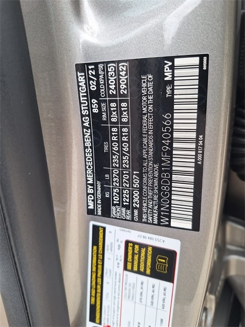 10.25" Center Touchscreen Display, 3.27 Axle Ratio, 4-Way Lumbar Support, 4-Wheel Disc Brakes, 6 Speakers, ABS brakes, Air Conditioning, Alloy wheels, AM/FM radio, Apple CarPlay®/Android Auto®, Auto tilt-away steering wheel, Auto-dimming door mirrors, Auto-dimming Rear-View mirror, Automatic temperature control, Brake assist, Bumpers: body-color, Child-Seat-Sensing Airbag, Delay-off headlights, Driver door bin, Driver vanity mirror, Dual front impact airbags, Dual front side impact airbags, Electronic Stability Control, Emergency communication system: eCall Emergency System, Exterior Parking Camera Rear, Four wheel independent suspension, Front anti-roll bar, Front Bucket Seats, Front Center Armrest, Front dual zone A/C, Front reading lights, Fully automatic headlights, Garage door transmitter: HomeLink, Genuine wood dashboard insert, Heated door mirrors, Heated Front Bucket Seats, Heated front seats, Illuminated entry, Knee airbag, Leather steering wheel, Low tire pressure warning, MB-Tex Upholstery, Memory seat, Occupant sensing airbag, Outside temperature display, Overhead airbag, Overhead console, Panic alarm, Passenger door bin, Passenger vanity mirror, Power door mirrors, Power driver seat, Power Front Seat w/Driver Memory, Power Liftgate, Power passenger seat, Power steering, Power windows, Radio data system, Radio: MBUX Multimedia System, Rain sensing wipers, Rear anti-roll bar, Rear fog lights, Rear reading lights, Rear seat center armrest, Rear window defroster, Rear window wiper, Remote keyless entry, Roof rack: rails only, Security system, Speed control, Speed-sensing steering, Split folding rear seat, Spoiler, Steering wheel memory, Steering wheel mounted audio controls, Tachometer, Telescoping steering wheel, Tilt steering wheel, Traction control, Trip computer, Turn signal indicator mirrors, Variably intermittent wipers, Wheels: 8J x 18 ET 38 Split 5-Spoke, Virtual appointments, Home Delivery.